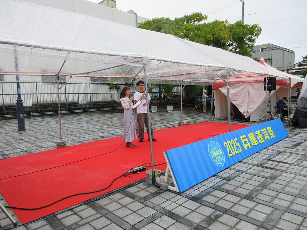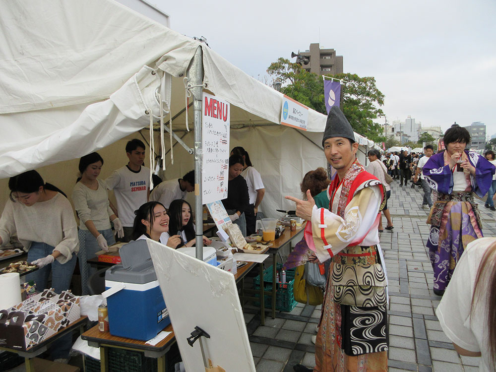 ゼミ生は事前に考えた店舗レイアウトと役割分担をもとに、売上目標の達成を目指して各人てきぱきと仕事をこなし、運河祭関係者の方々や購入して下さった皆様から好評をいただきました。メインステージではプロジェクトリーダーを務めた杼谷晃生君がインタビューを受け、メニュー開発の経緯や苦労譚、商品の宣伝を熱く語りました。