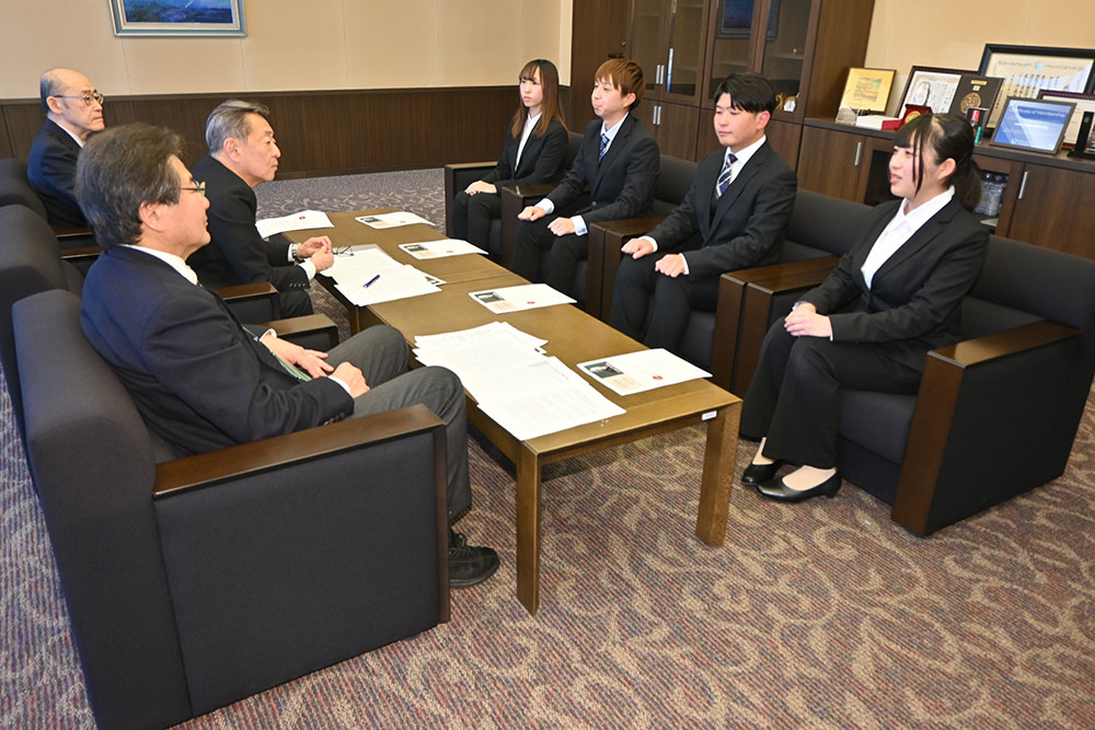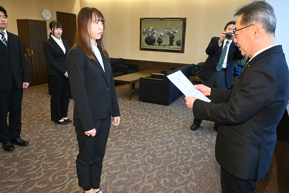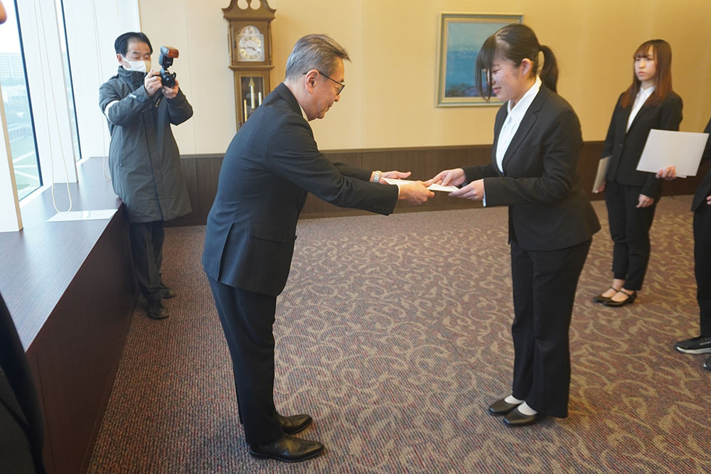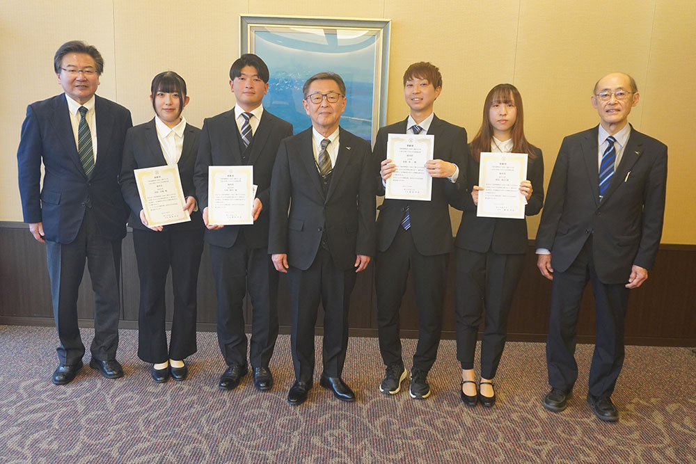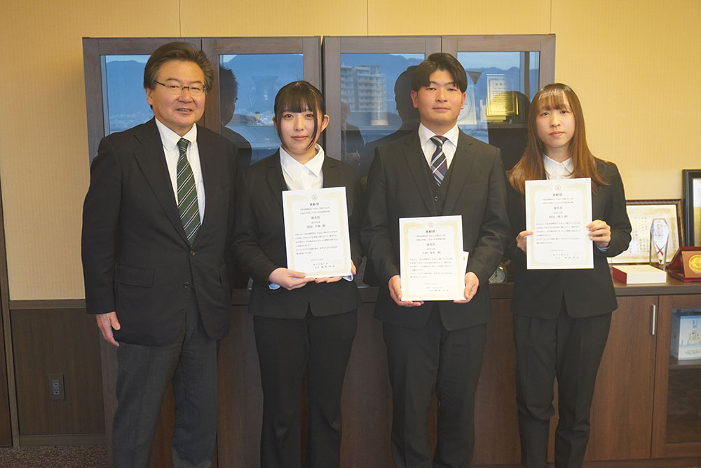今回、114名から応募があり、所属学部や氏名を伏せた上で、備酒 学長、春藤 副学長、田中 学長補佐、及び学生広報サポーター2名による厳正なる審査の結果、4名に優秀賞が授与され、経営学部から、岡屋 璃奈さん、別府 幸穂さん、大西 凜央さんの3名(全員3年次生)が受賞しました。